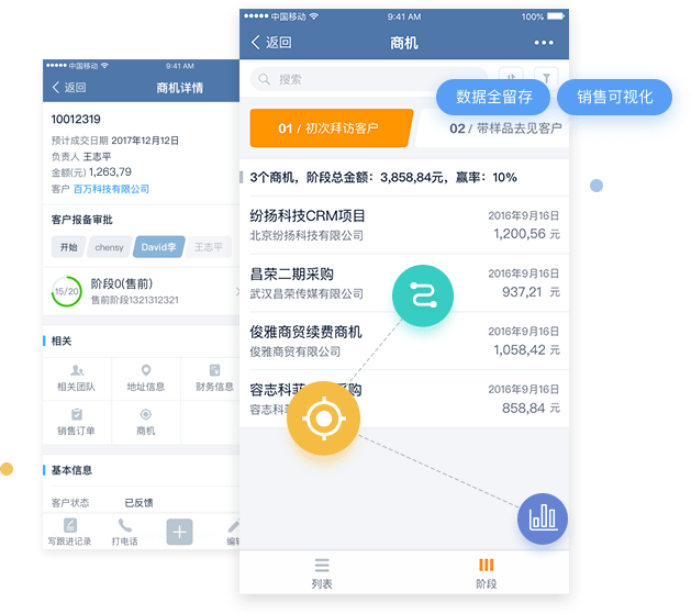 从线索-商机-成交数据全留存,不同阶段不同销售流程;
