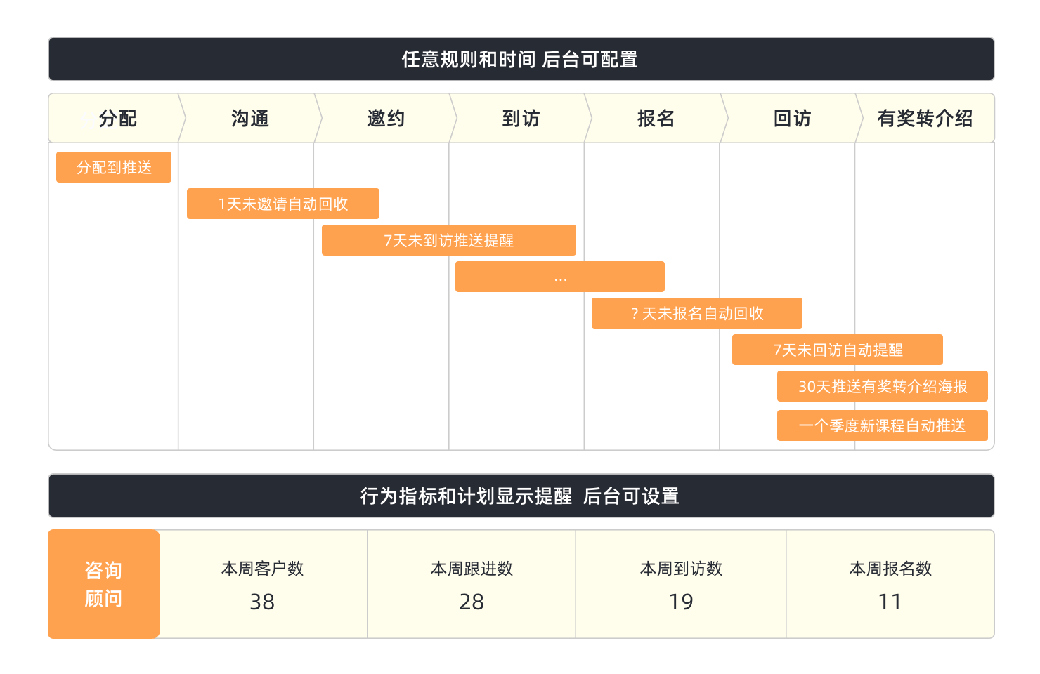 智能化销售跟进过程:系统设定咨询跟进推进阶段,按阶段自动提醒咨询老师,提升咨询工作效率。