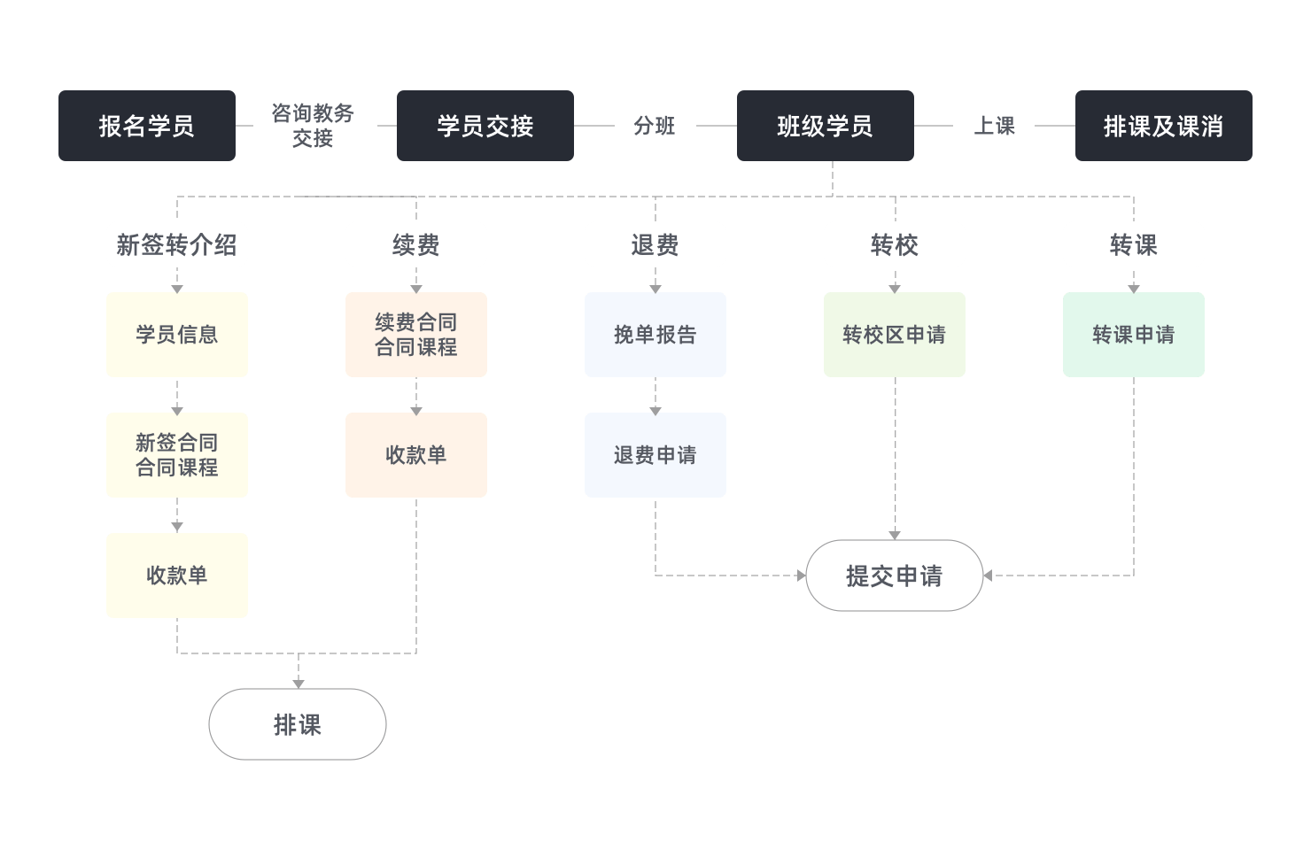 学员异动管理,提升教务工作效率,优化学员服务体验:合同变更、升级/降级、转班/转校、考勤/补课、挽单/退费、续费/转介绍。