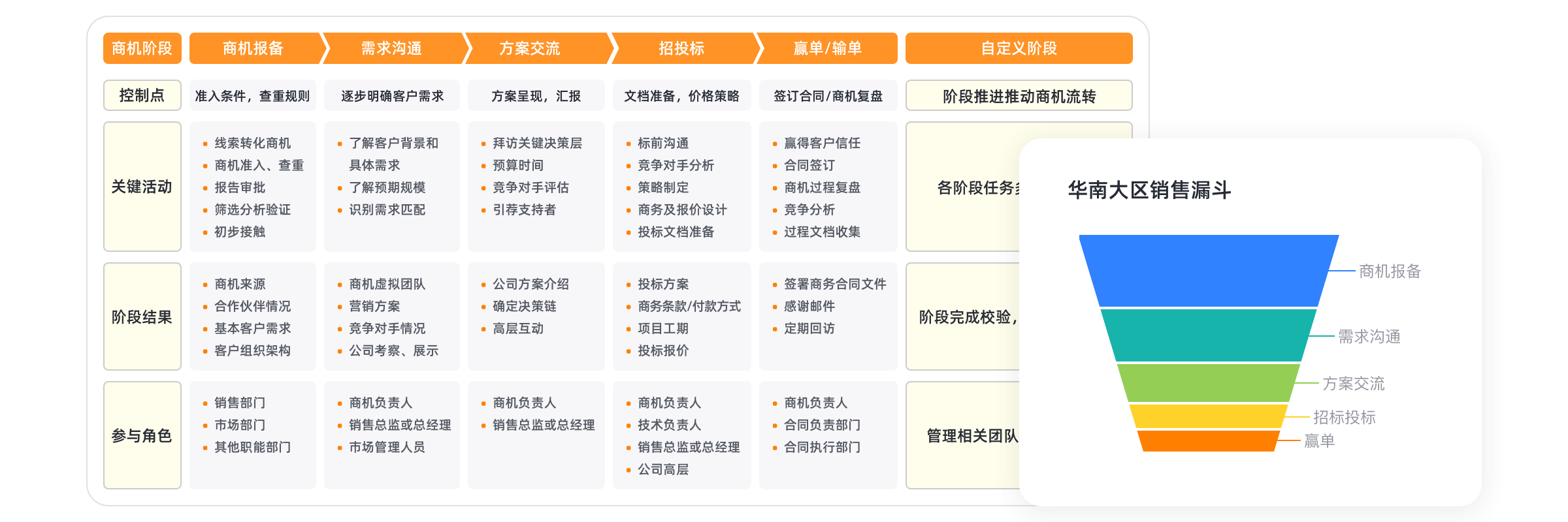 商机跟进:在竞争激烈的大环境下,如何通过精细商机阶段管理,加速赢单转化周期?同时,在面对复杂项目采购周期长,参与决策人员众多,招投标流程复杂等现状,如何跨部门高效协同?